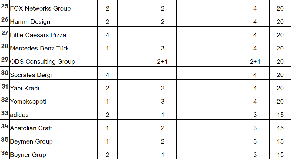 Global ve yerel birçok markanın olduğu listede ODS Consulting Group olarak 29. sırada yer alarak en iyi “Reklamverenler” listesine girdik. Bununla birlikte “Yılın En Yaratıcı Ajans”ı kategorisinde ODS Consulting Group’un yatırımcısı olduğu Adorno Reklam Ajansı başarısını yukarılara taşıyarak 19. sırada yerini aldı. 2 Kristal Elma, 1 tane de büyük ödül alarak henüz 2. senesinde büyük başarı yakaladı.